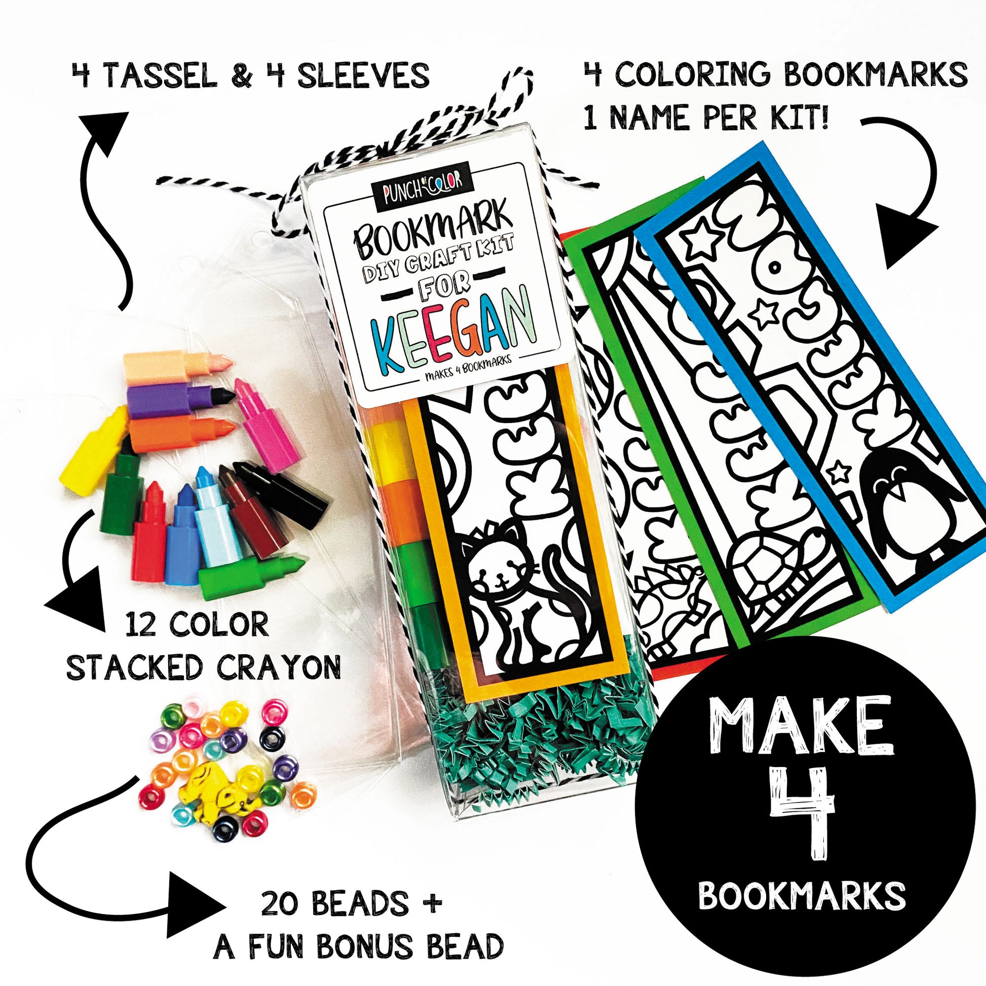 Unleash the creativity of young bookworms with our bookmark making craft kit. This delightful kit includes everything you need to create 4 personalized coloring bookmarks, making reading an even more enjoyable experience. The perfect custom stocking stuffer, that comes to you sealed with yarn and ready to gift!