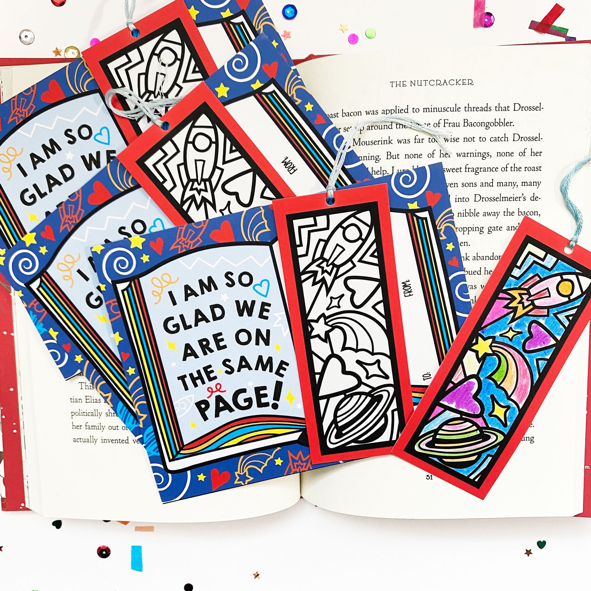 Promote reading this Valentine's! These outer space themed valentine's cards come with a bookmark that kiddos can color and use with their favorite book. There is a place to write "to" and "from", or leave that area blank.
