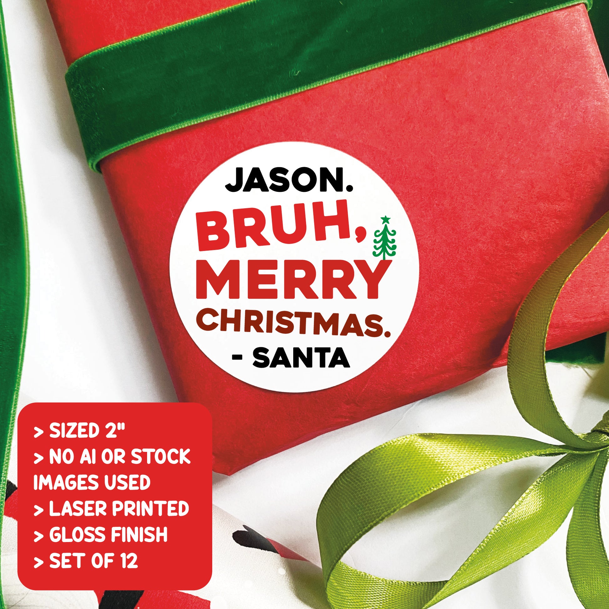 Make holiday gift-giving easier with our custom printed BRUH Christmas gift stickers! Each label comes with a custom printed name, so you won’t have to fill out tags over and over again—just peel and stick!