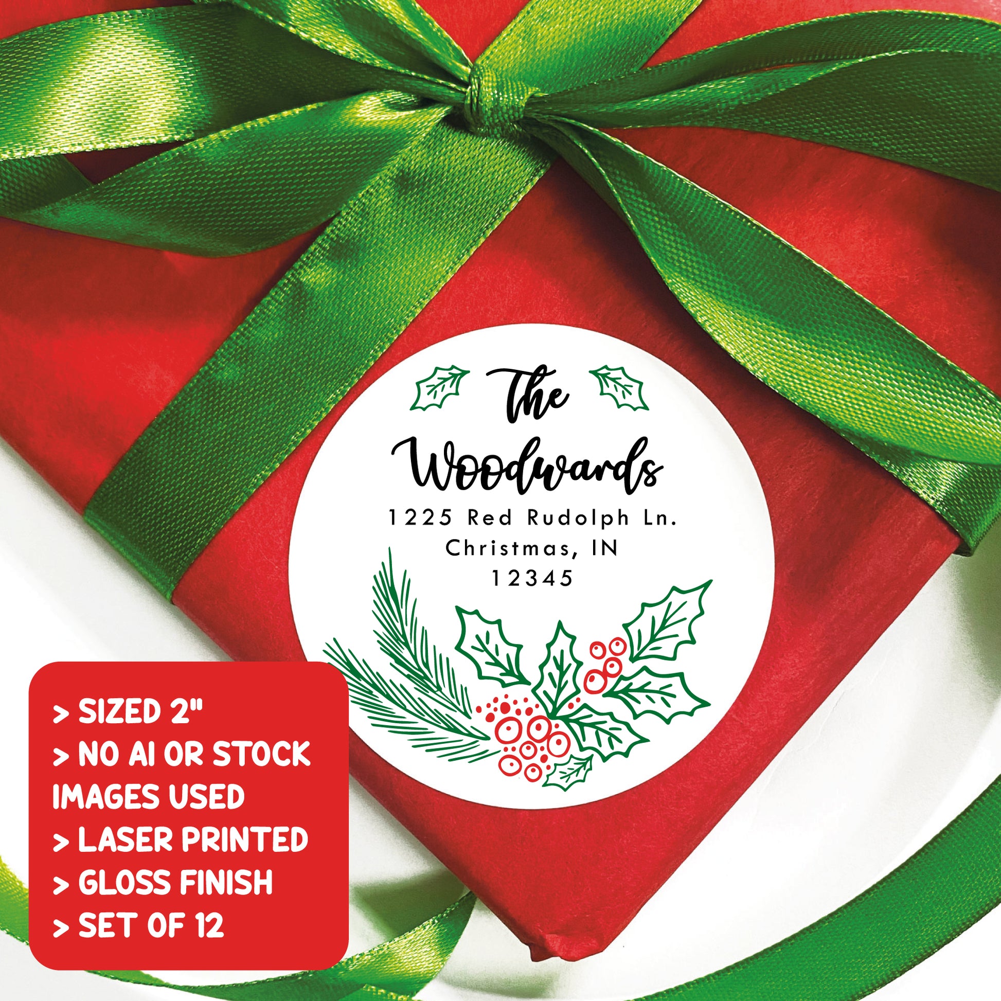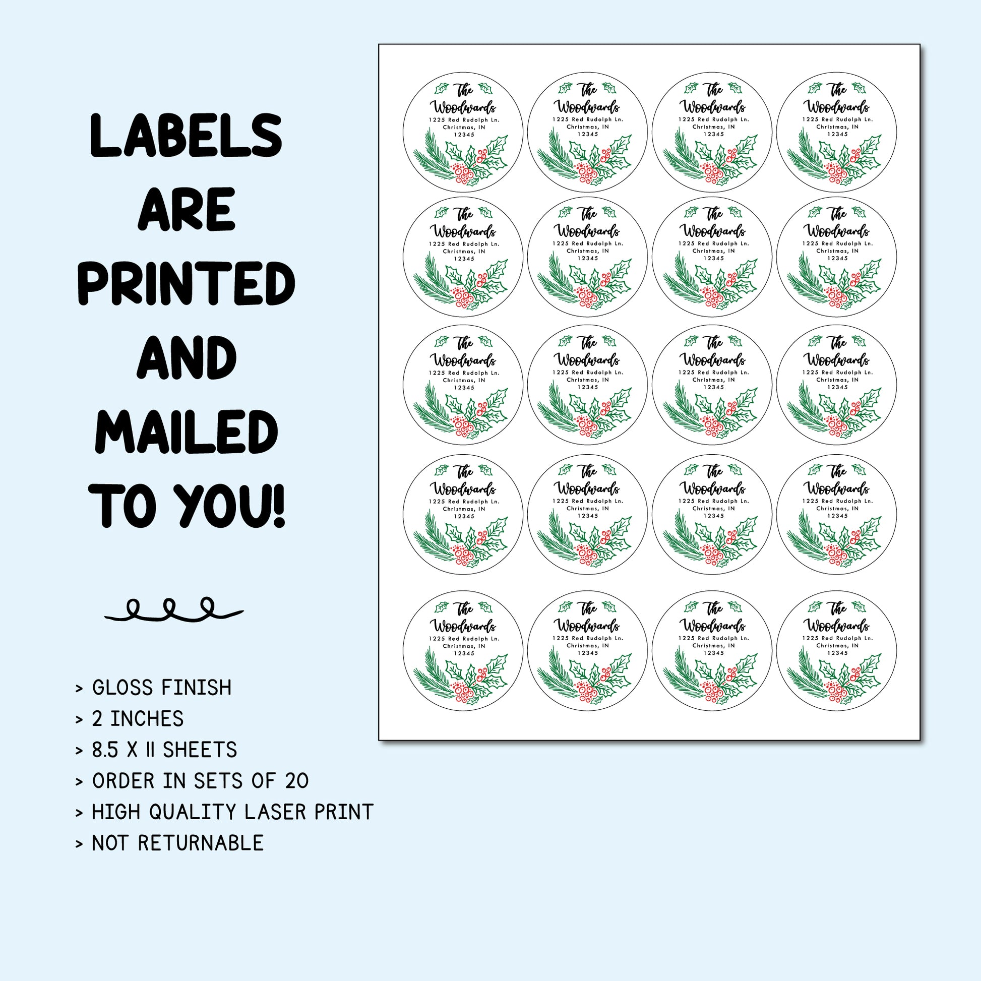 Each sheet includes 20 laser printed gloss stickers featuring a hand drawn holly design. Stickers are smudge free and measure 2 inches around.