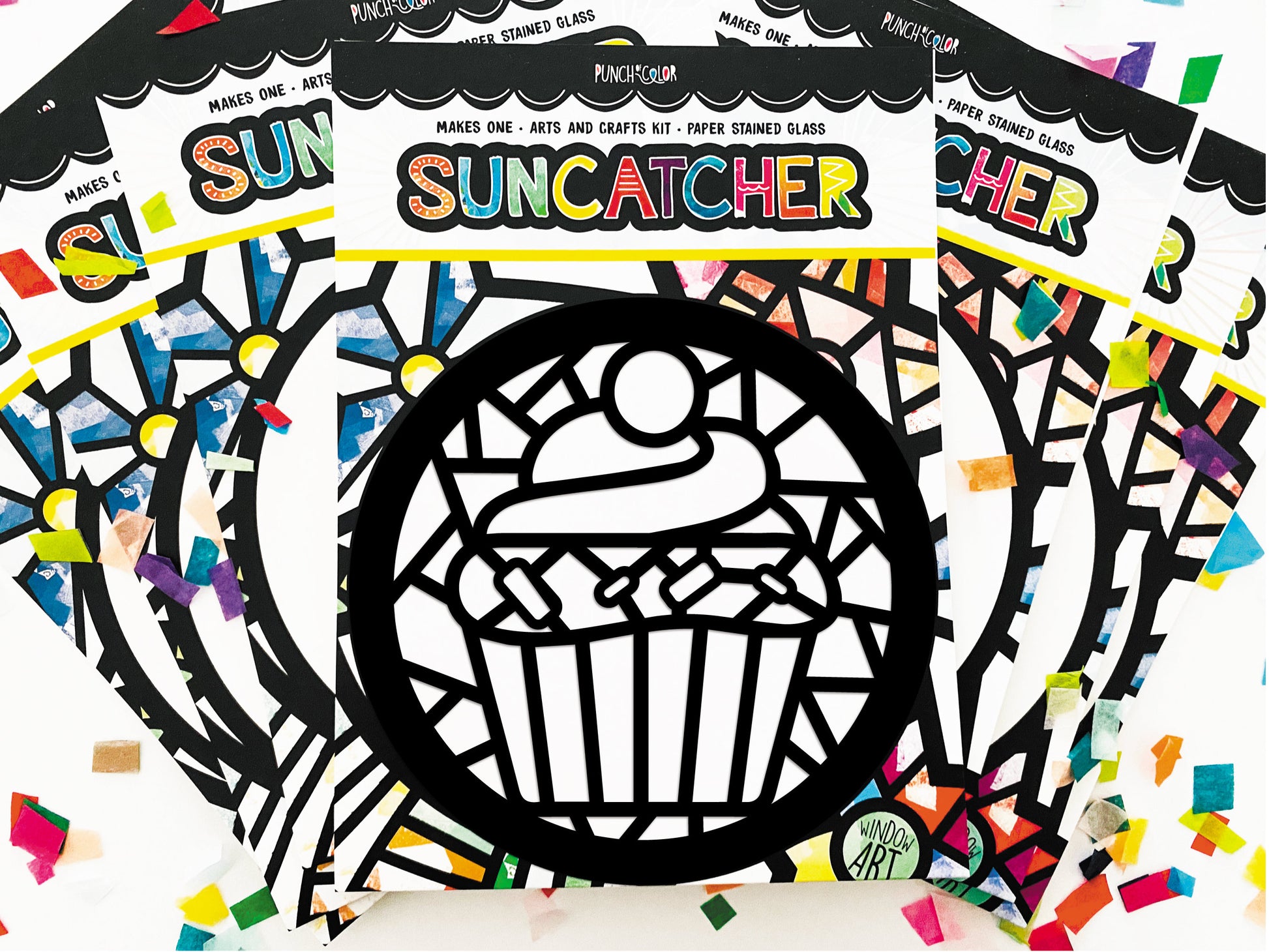 Hosting a colorful birthday party and needing a simple, mess-free craft for the kids? These paper cupcake suncatcher crafts are the perfect activity for toddlers and older children. Kiddos will easily be able to create colorful suncatchers with the materials included - hang them in front of your window when done for a beautiful effect! The suncatchers are created on black cardstock, and each measures approximately 5 inches around.