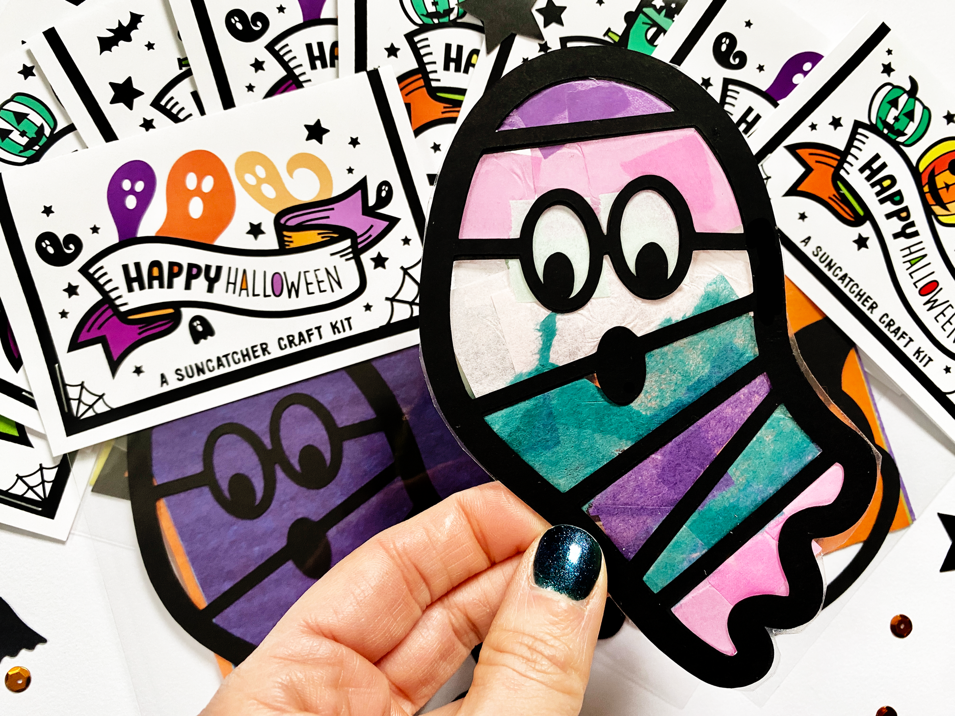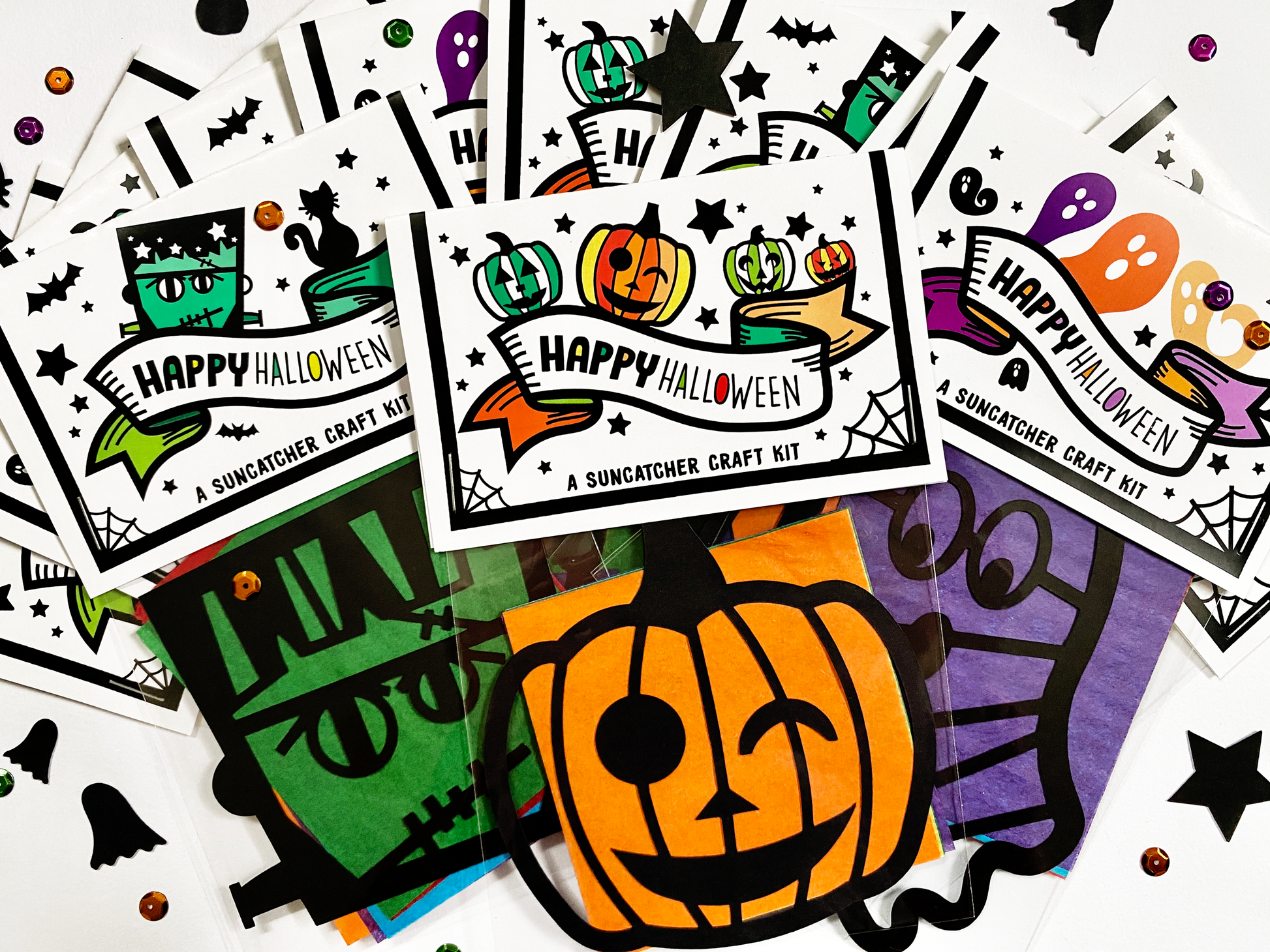 This kit includes materials to create 15 Halloween party favor kits to give out to guests at your spooky bash, or add to your boo baskets! The recipient will be able to create a simple paper tissue suncatcher to place on their window. The kits are 4 by 7 inches when assembled.