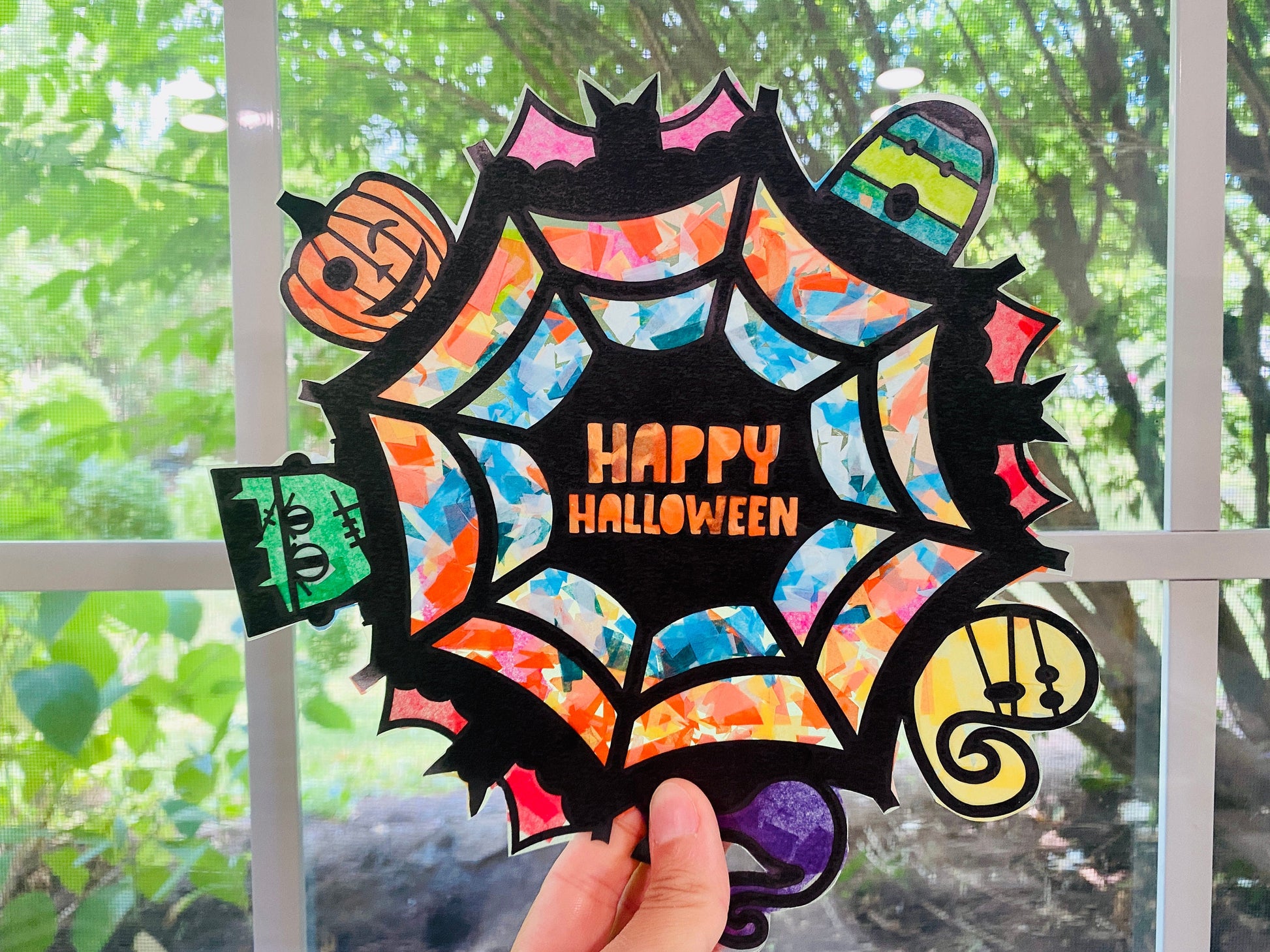 Create a Happy Halloween wreath with this simple DIY paper craft kit. Add this craft to your fall party and kids of all ages will take home paper stained glass art to place on their window. The kit comes with everything you need to create this suncatcher - tissue paper, directions and contact paper (optional at checkout.) A creative, mess-free project for the spooky season! This kit measures approximately 7.5 inches wide...this is not a wreath for your door!