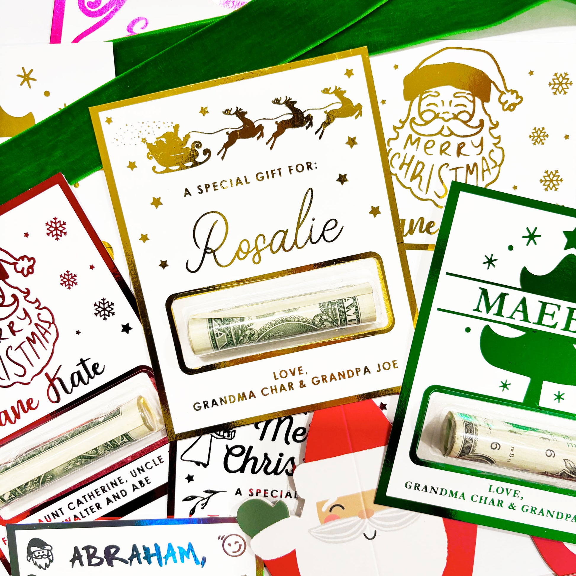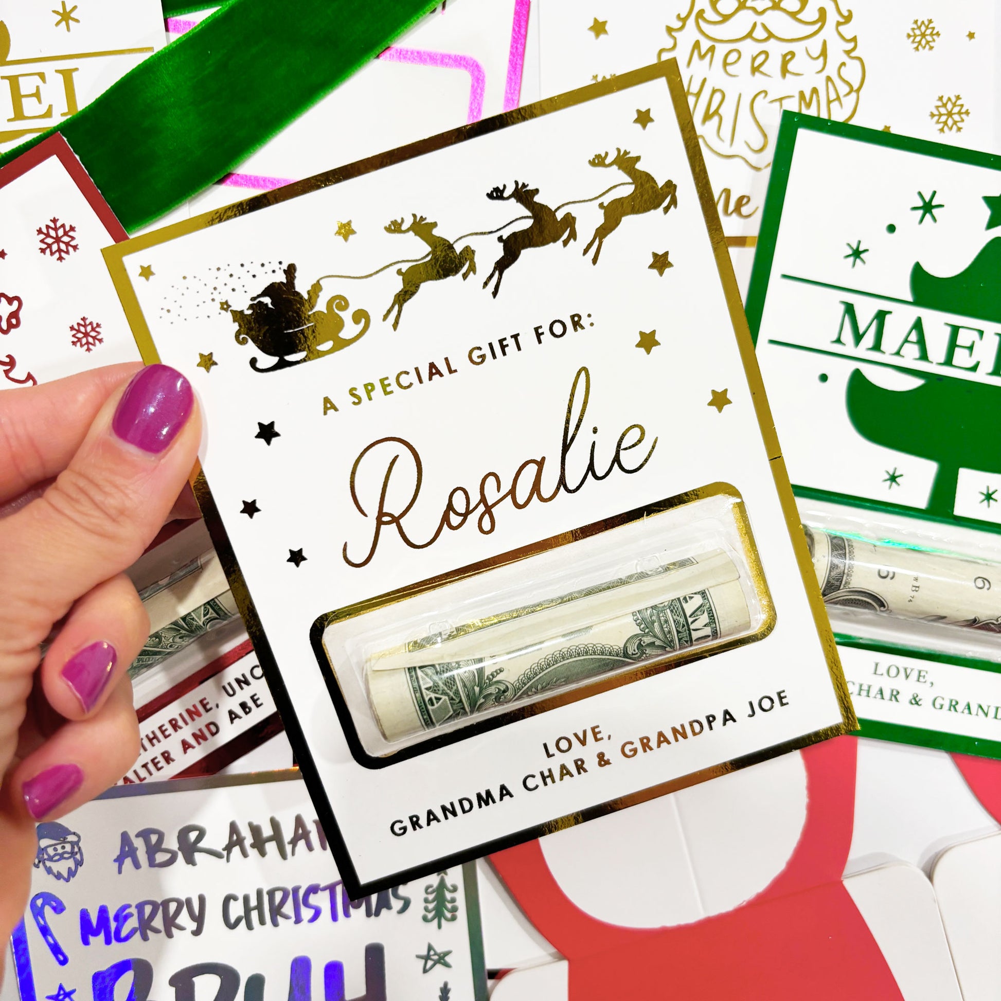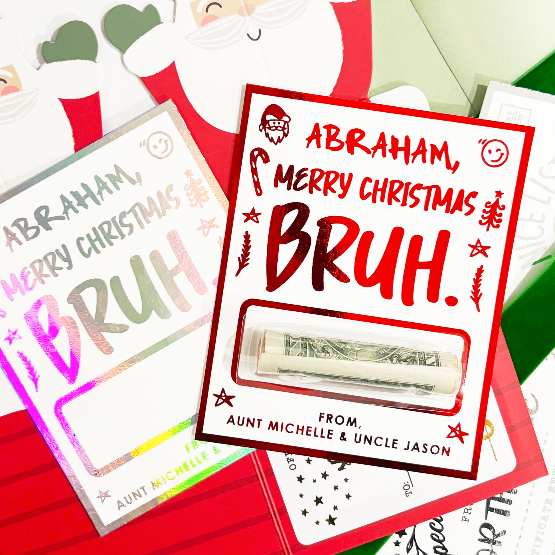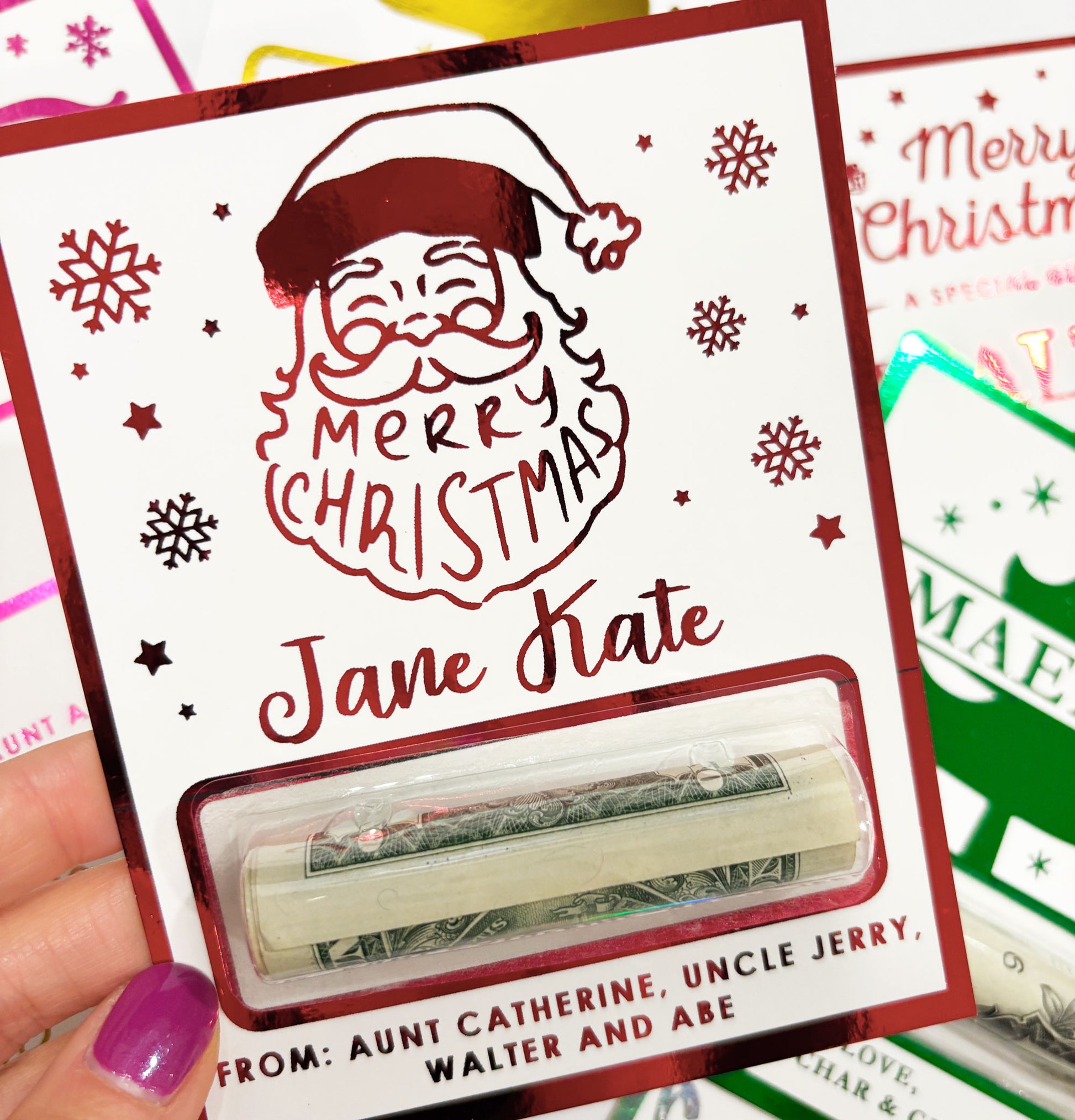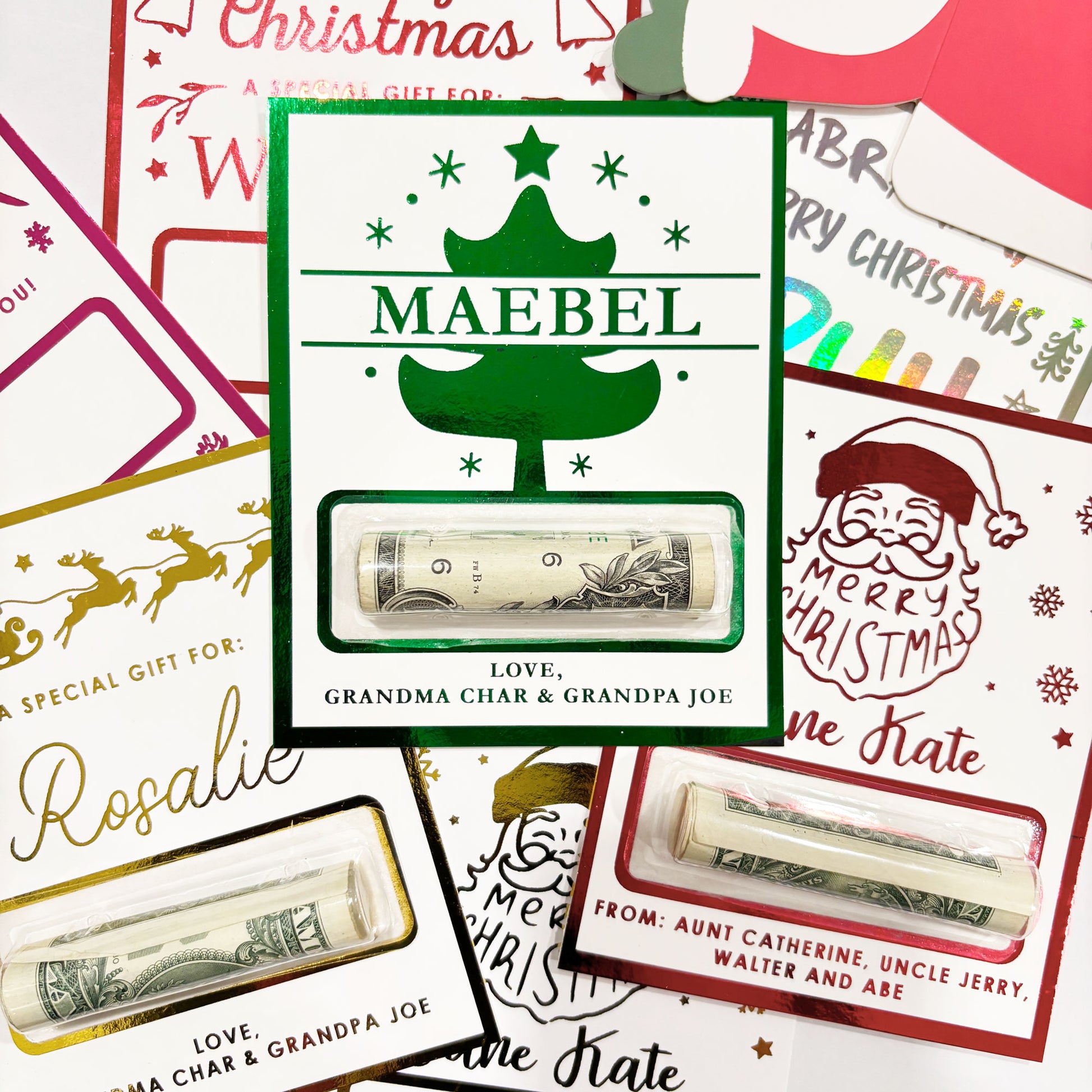 Make gifting money feel extra special with our personalized foil money holders! Each holder is custom made with a foil color of yoru choice, and personalized for your gifting needs. Choose from 6 unique designs at checkout. Perfect for those hard-to-shop-for loved ones, these festive Christmas money holders turn a simple cash gift into a shiny surprise.