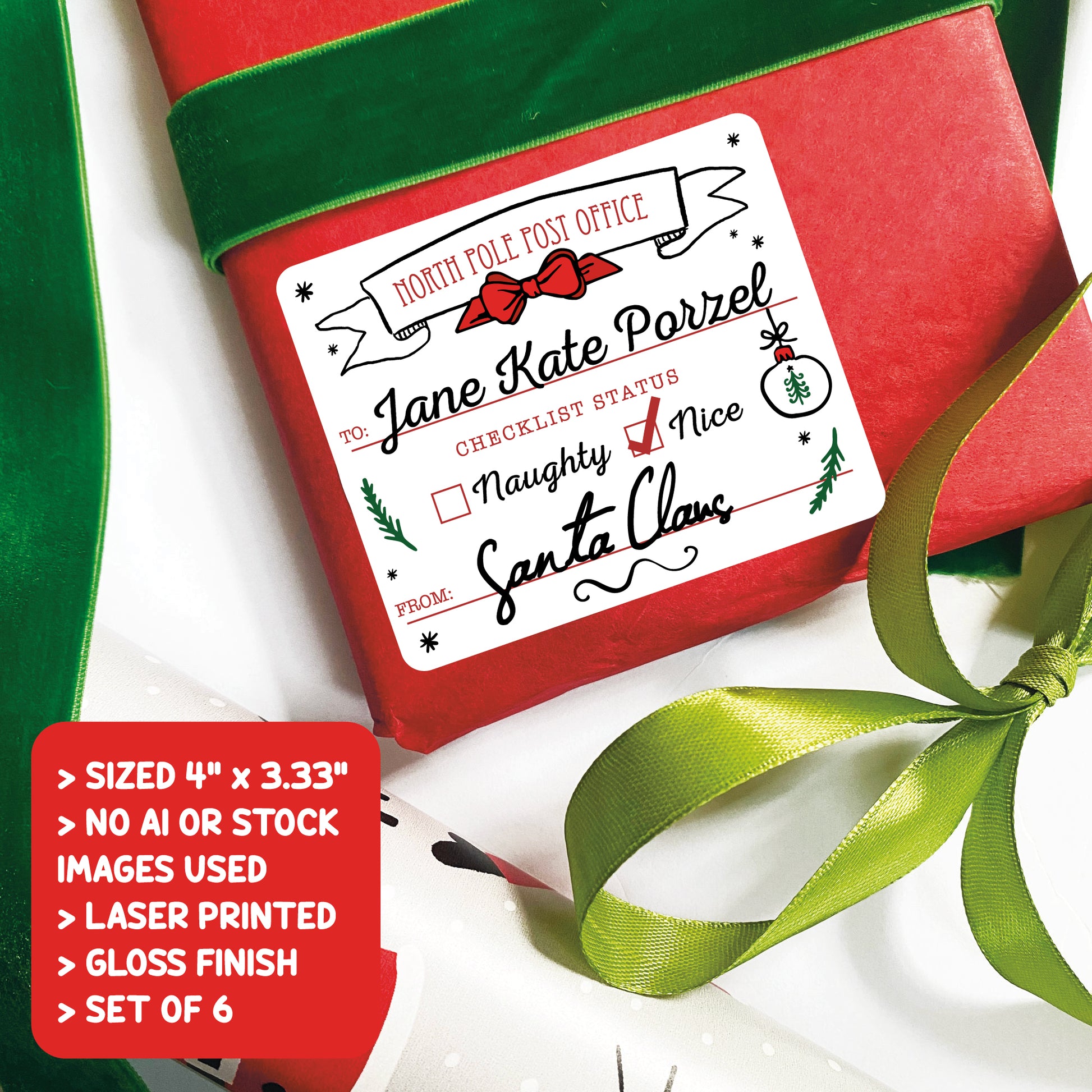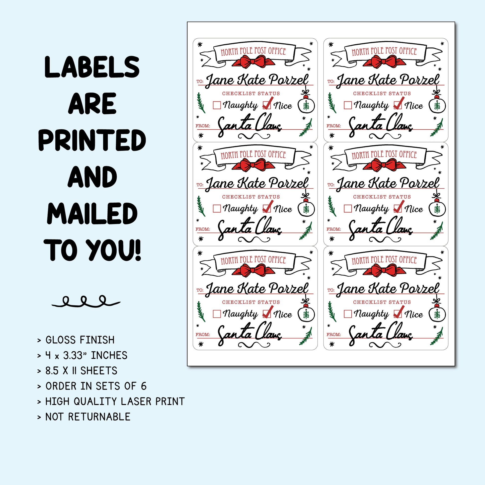 Each sheet includes 6 laser printed gloss stickers featuring a whimsical, hand-drawn Christmas design. Stickers are smudge free and measure 2.5 inches around.