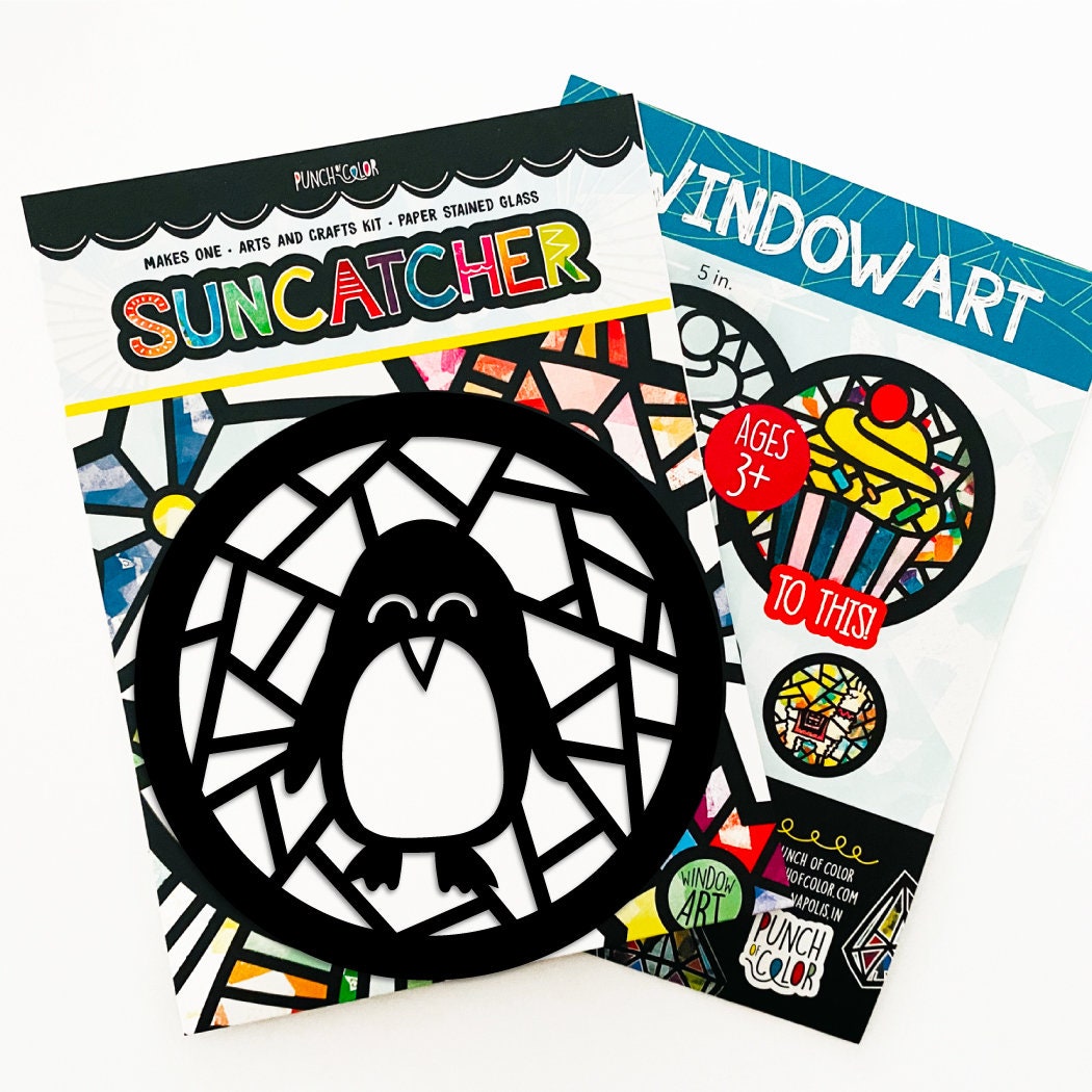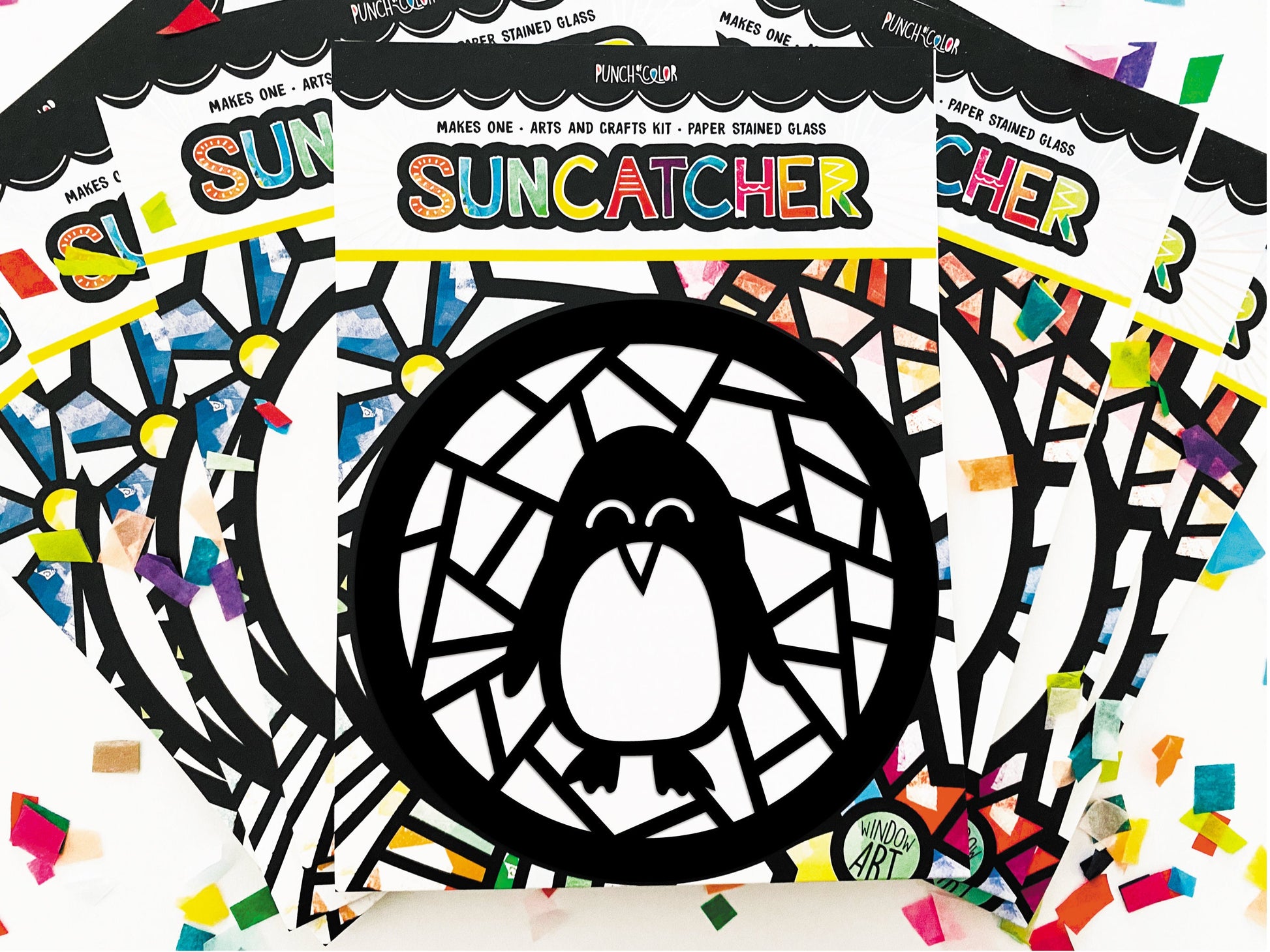 Hosting a winer animal party and needing a simple, mess-free craft for the kids? These paper penguin suncatcher crafts are the perfect activity for toddlers and older children. Kiddos will easily be able to create colorful suncatchers with the materials included - hang them in front of your window when done for a beautiful effect! The suncatchers are created on black cardstock, and each measures approximately 5 inches around.