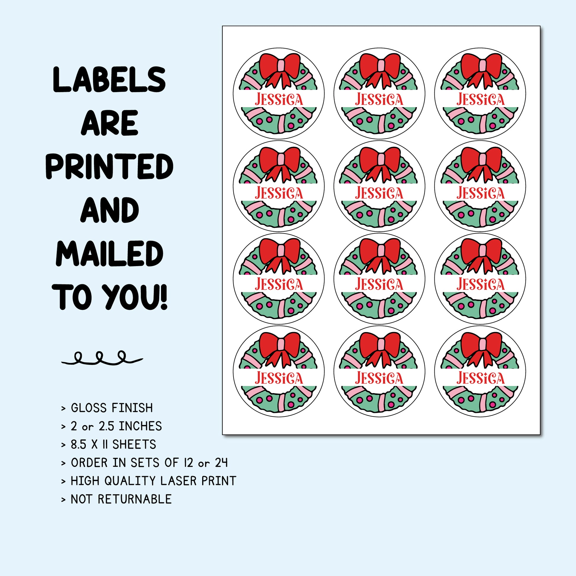 Each sheet includes 12 laser printed gloss stickers featuring our hand-drawn Christmas artwork. Stickers are smudge free and measure 2.5 inches around.