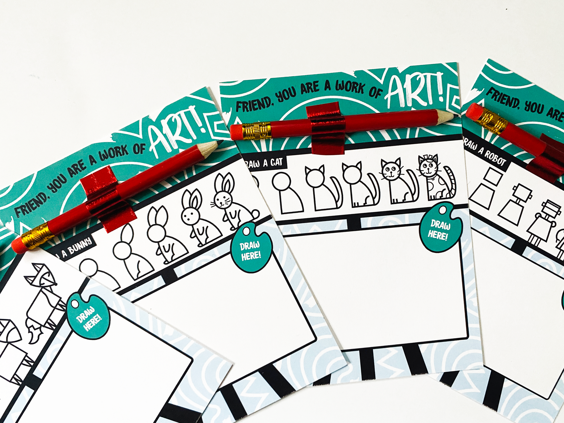This set of 12 drawing Valentine's is perfect for children who love art! Each step-by-step drawing card breaks down a more complex object into simple shapes. 4 designs are included in this set (bunny, robot, fox, cat). You will receive the cards and pencils unassembled. You can attach the pencils with washi tape or glue dots (not included.)