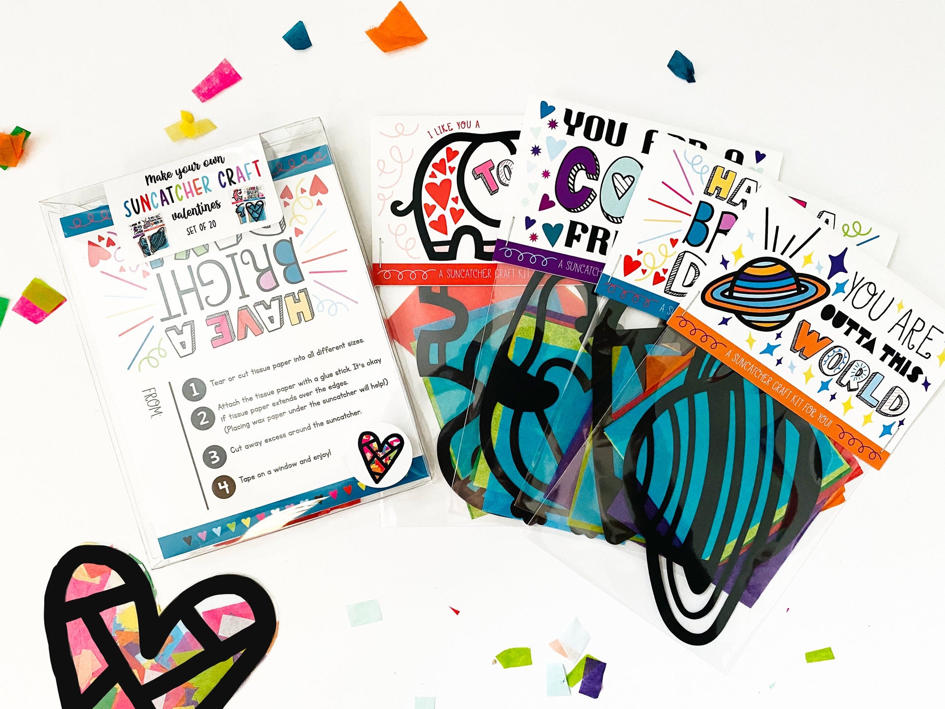 A unique Valentine's Card that is a craft kit and valentine in one! This set of Valentine's comes with suncatcher cut-outs, tissue paper, and bags to create mini suncatcher kits. 4 designs in total are included (hearts, planets, elephants, and penguins.) Choose from assembled or unassembled in the drop-down. There is a place to write "from", or leave that area blank. A crafty addition to classroom exchanges.