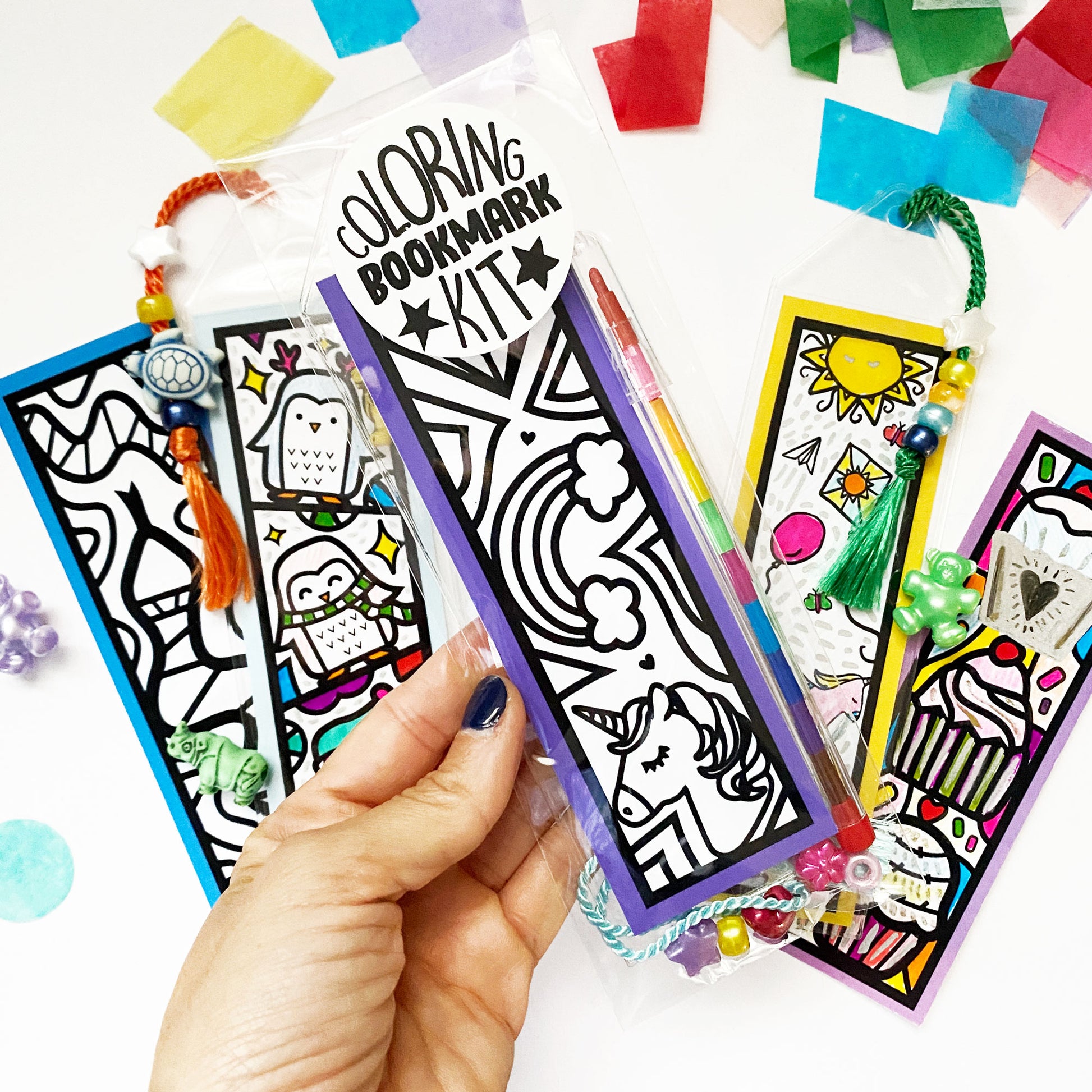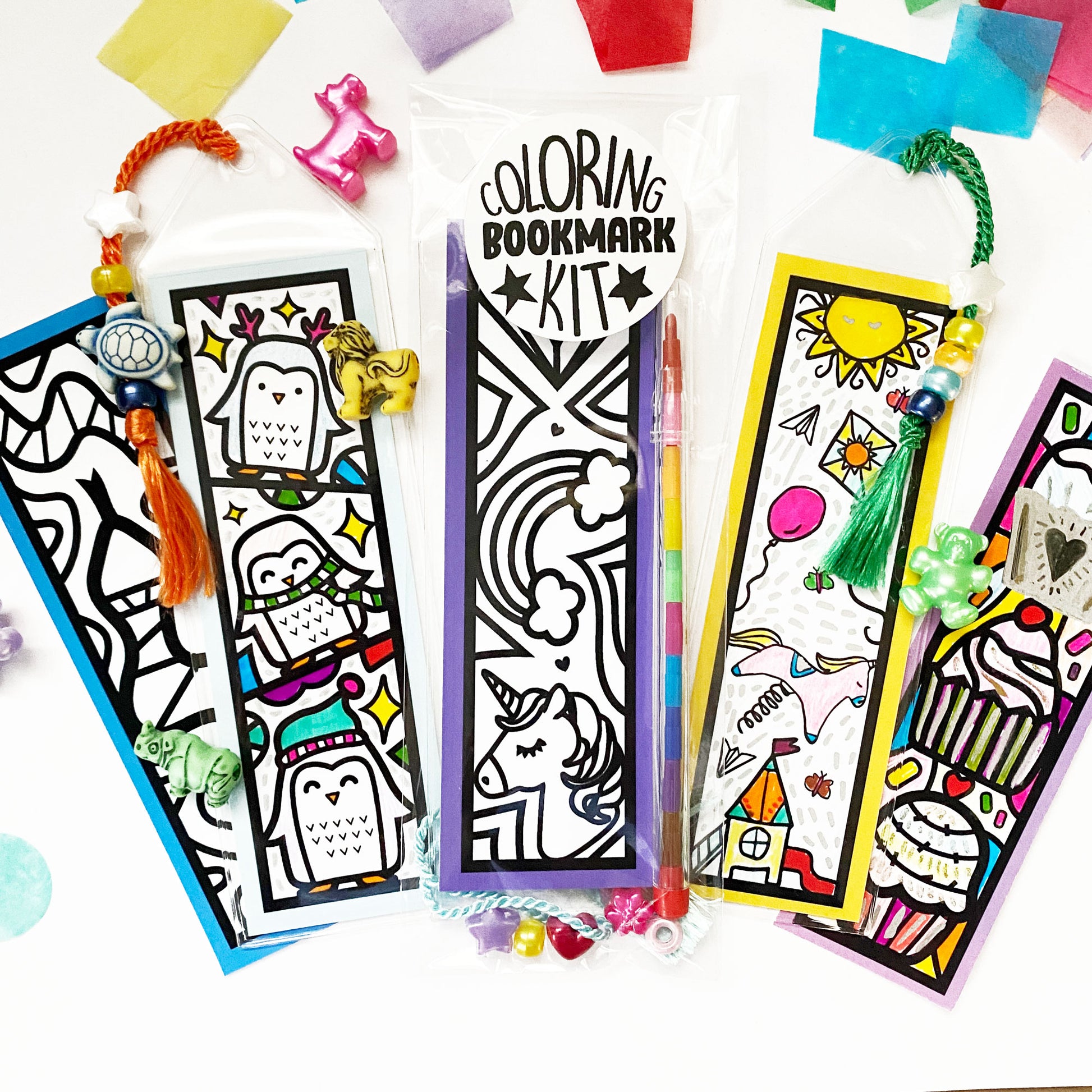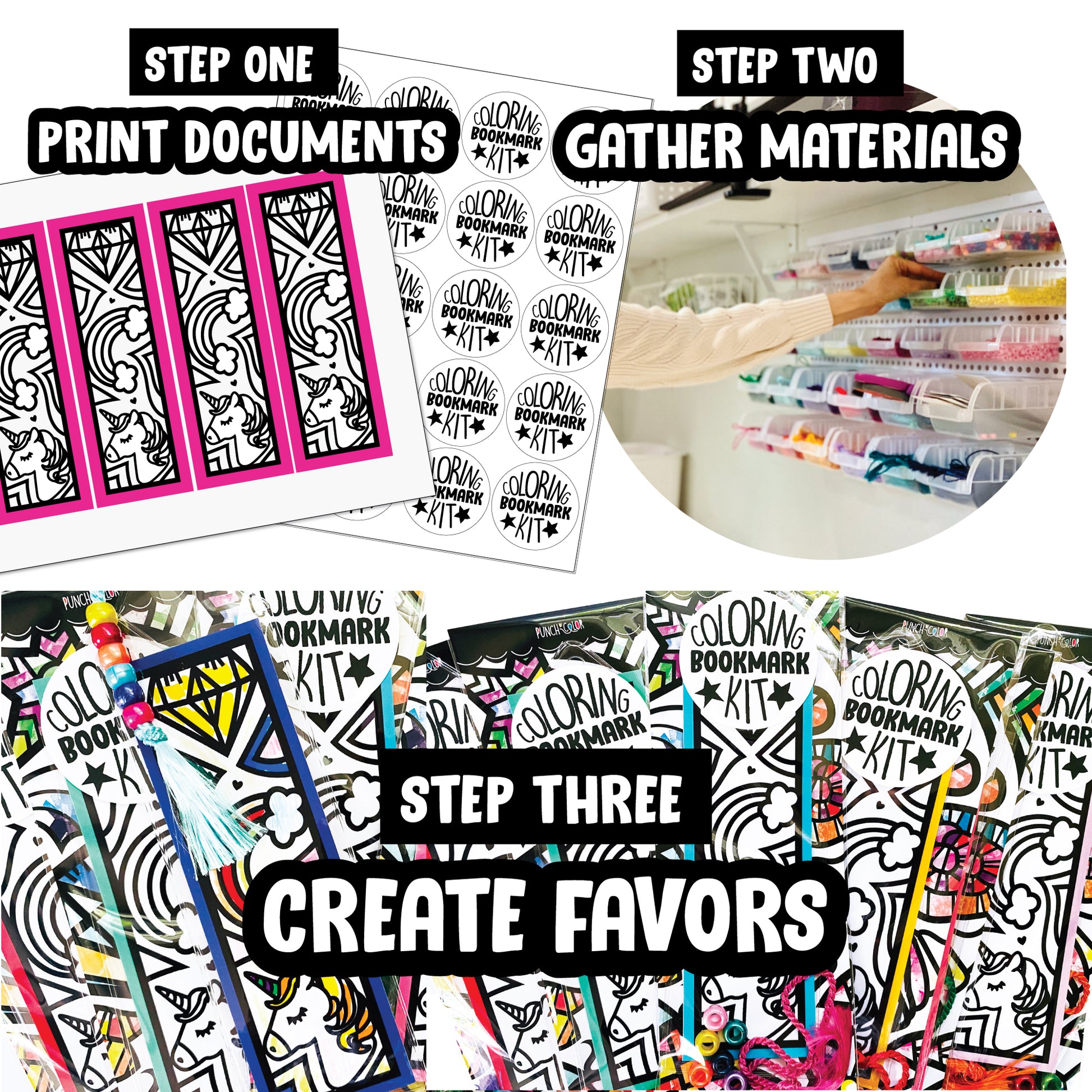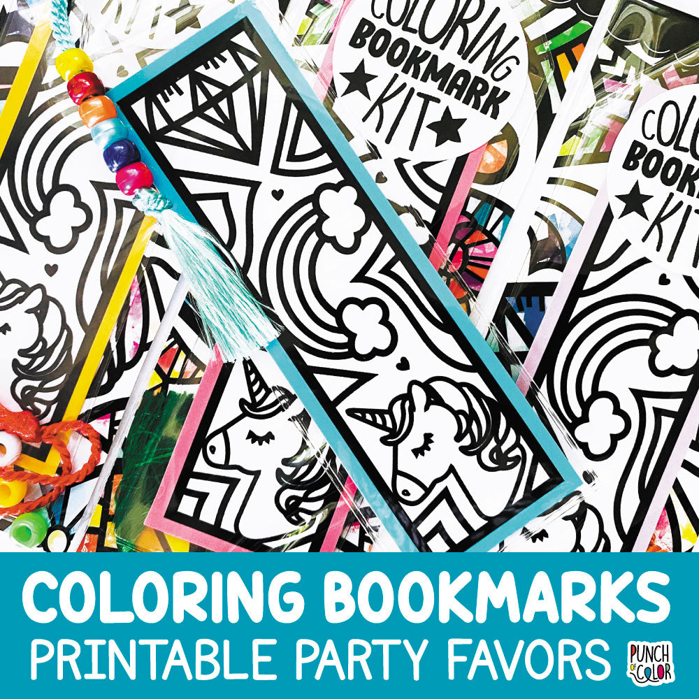 These unicorn coloring bookmarks are perfect party favors and birthday activities! Simply print this pdf on cardstock, cut on a paper cutter and set out at your party or follow our directions to make favor bags. The recipient will create a simple beaded tassel (optional), and color their bookmark (works well with markers, colored pencils, crayons, gel pens, & metallic sharpies).