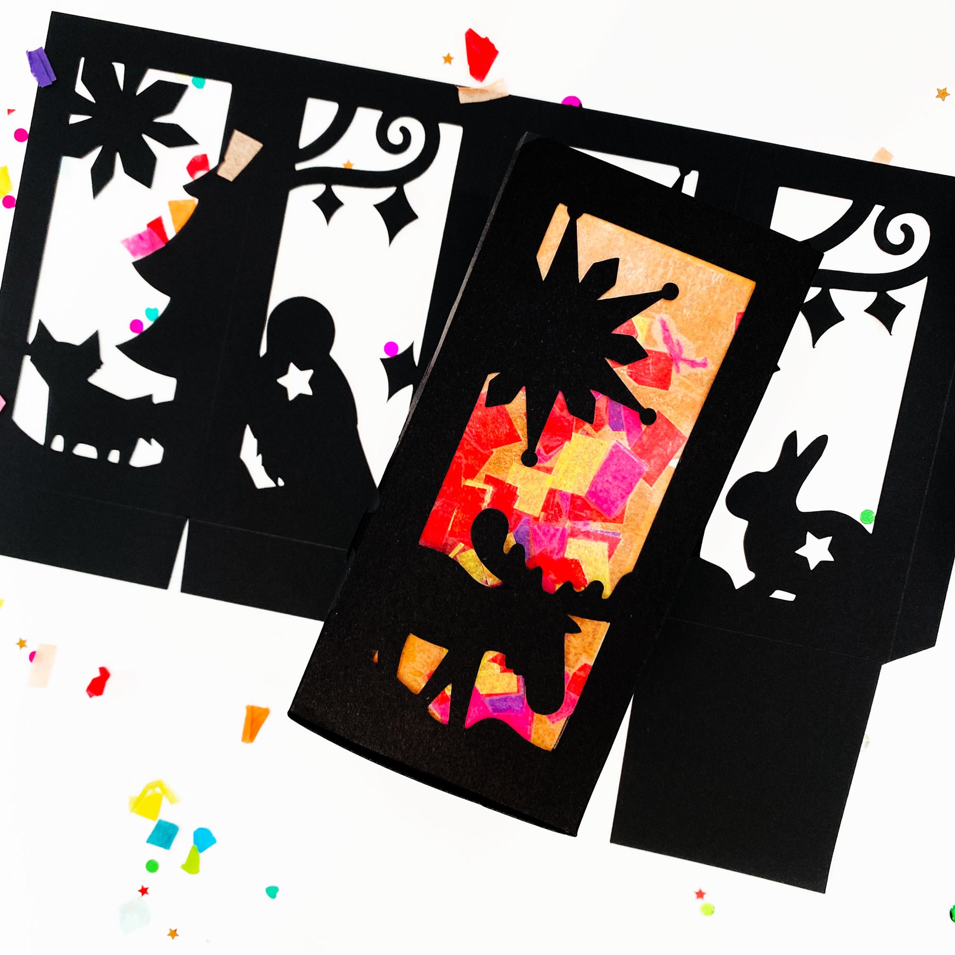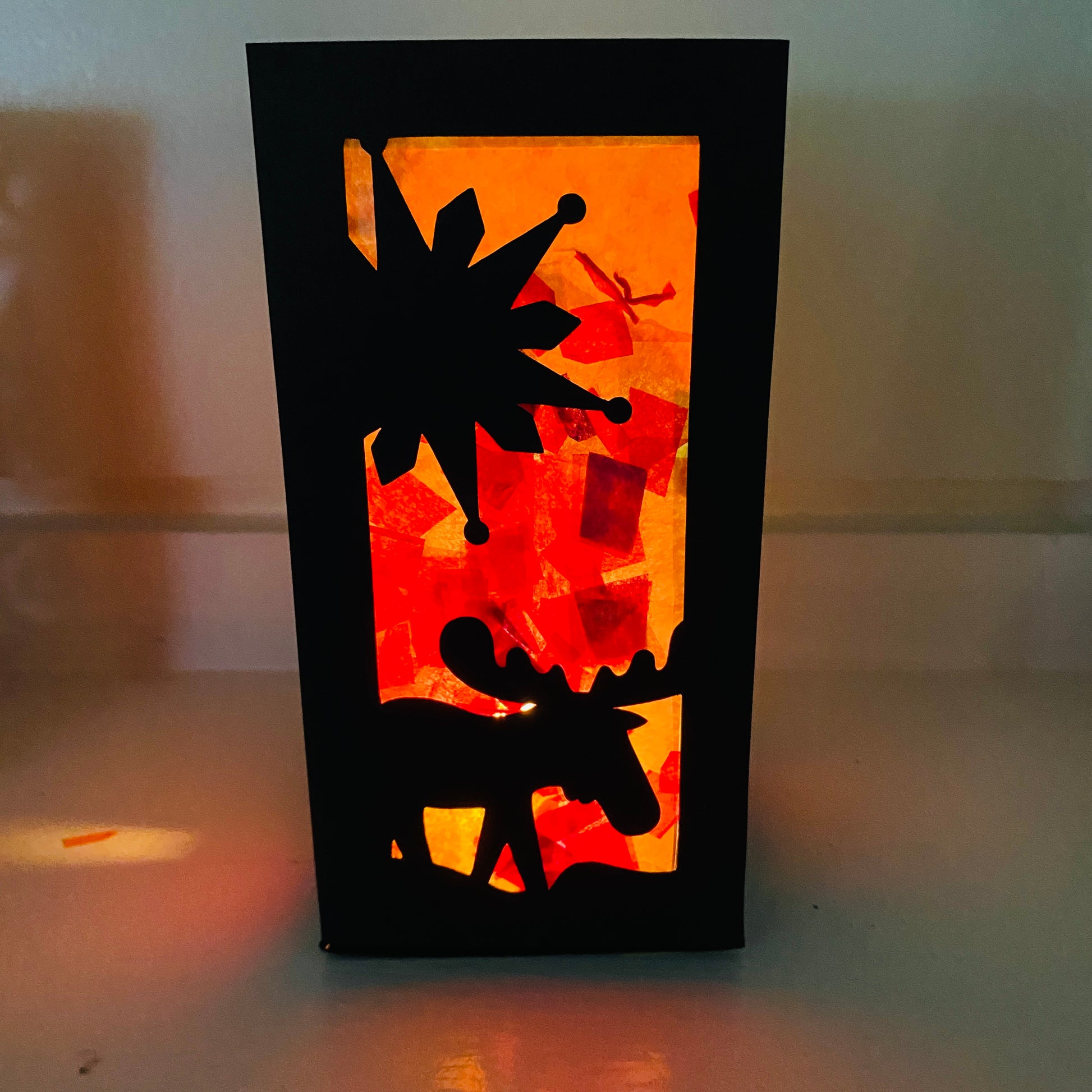 Create an easy animal-themed tissue paper lantern to decorate for the winter season! This is a simple luminary craft toddlers up to elementary aged girls and boys will love. Simply stick tissue paper onto contact paper, attach onto the paper lanterns, assemble and you are done! Place a battery operated (not included) white tea light inside and watch the colors light up. The lantern is approximately 5.5 by 2.5 when completed.